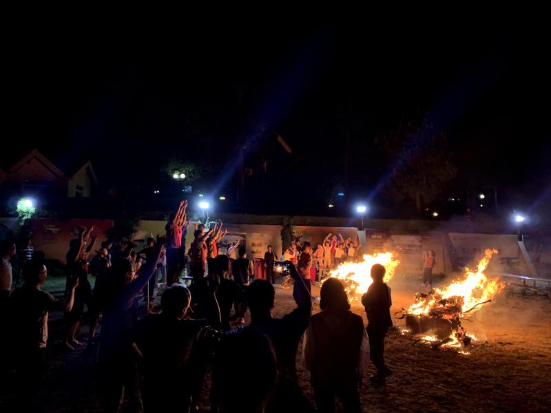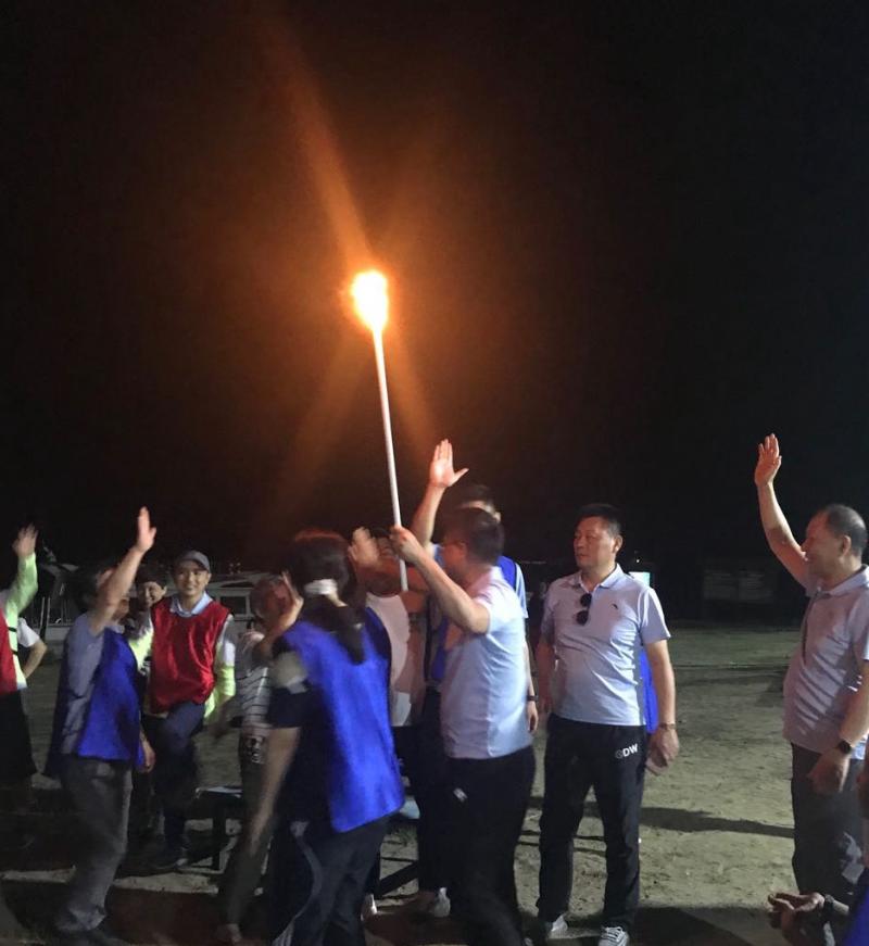 夜幕四合,工會主席王志凌點燃了火把,拉開了篝火晚會的序幕。在輕快歡快的音樂節(jié)拍下,紅藍兩隊隊員們手拉著手、肩并肩圍著熊熊篝火歡呼著、舞動著、跳躍著、歌唱著,隊員們完全沉浸在歡樂的海洋里……當《朋友》之歌響起時,在場所有人一起放聲歌唱,將本次活動的氣氛推向高潮!